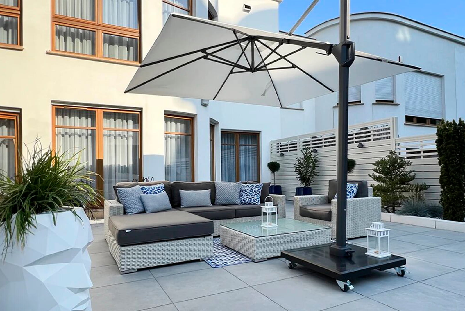 Большой зонт ICON 4×3 м от нидерландского бренда Platinum не только защитит от солнца, но и подчеркнет престиж вашего пространства. Декоративные подушки, коврики для улицы и фонари завершат композицию, придавая террасе индивидуальность и уют.
