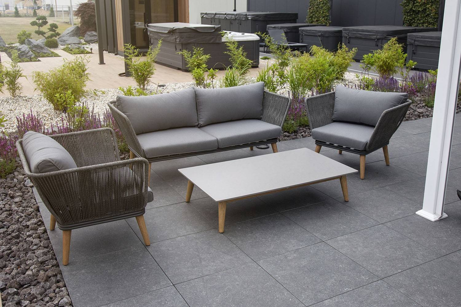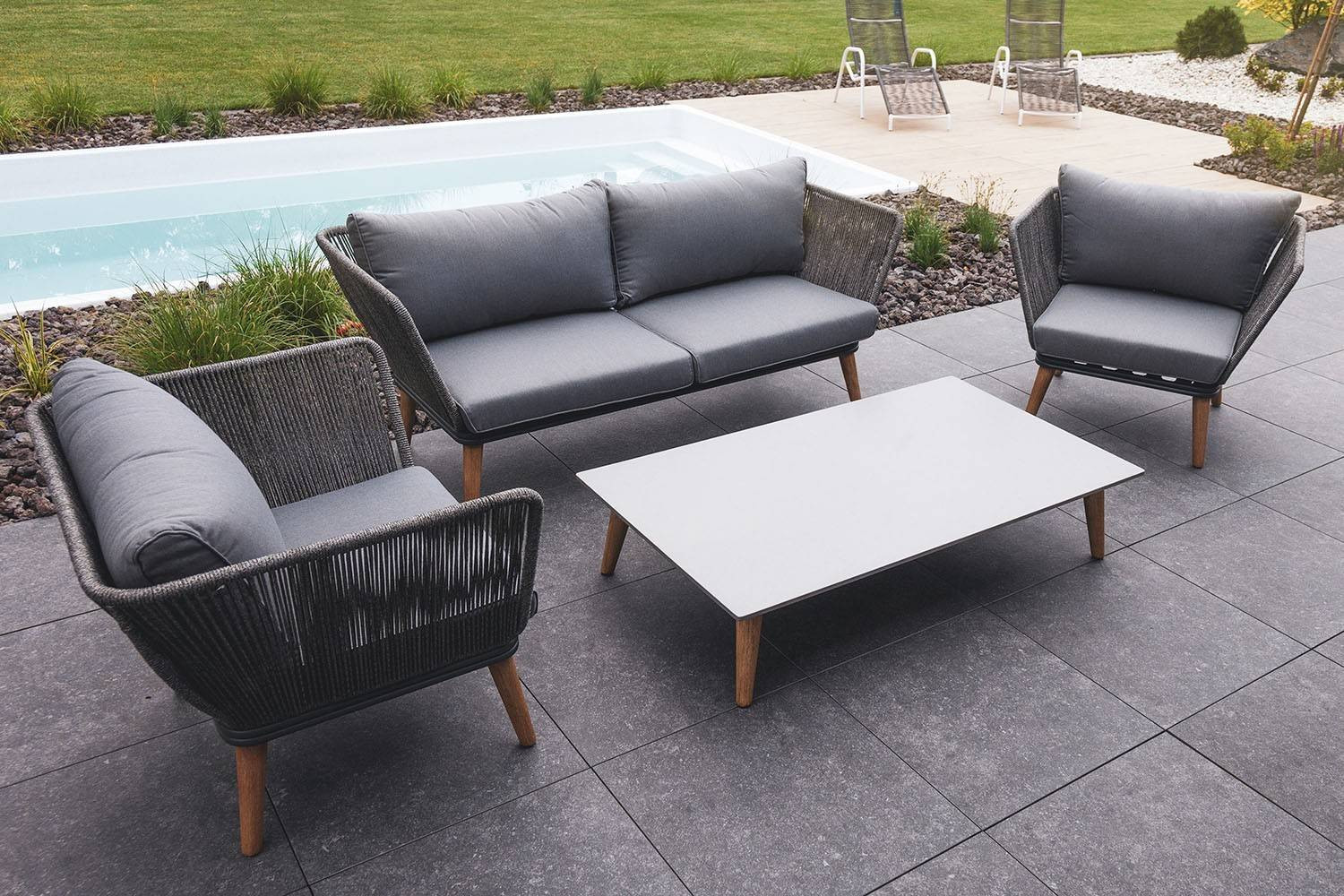 Садовая мебель КОРФУ IV (CORFU IV) мастерски сочетает в себе модный дизайн с функциональными ценностями. Толстые мягкие подушки сиденья не только обеспечивают максимальный комфорт отдыха, но и эффективно противостоят изменяющимся погодным условиям. Сочетание твердого, светлого дерева и серого шнура из полипропилена дает необычный эффект, идеально соответствующий последним тенденциям дизайна.