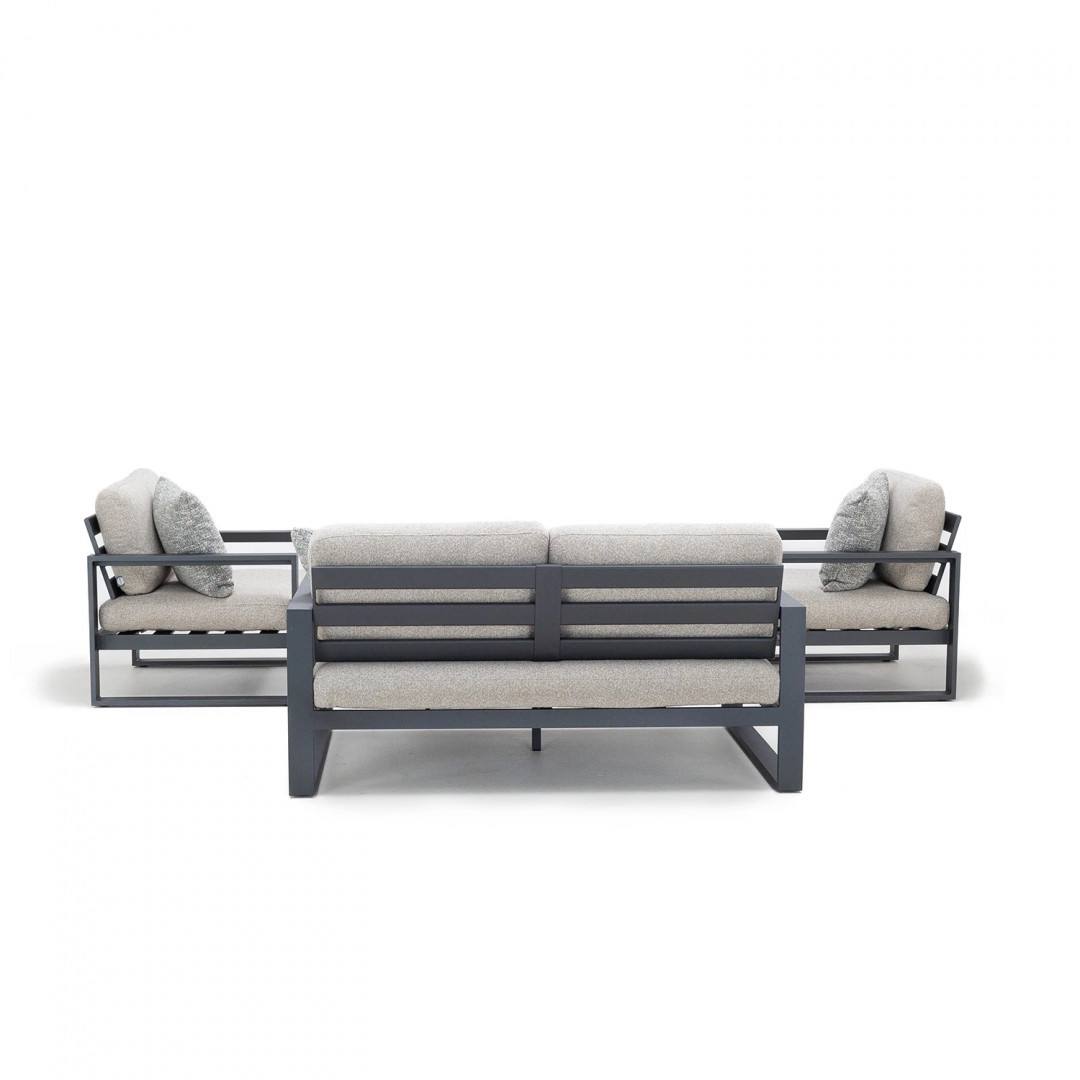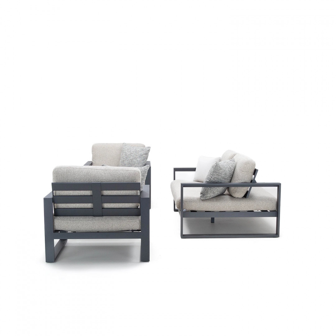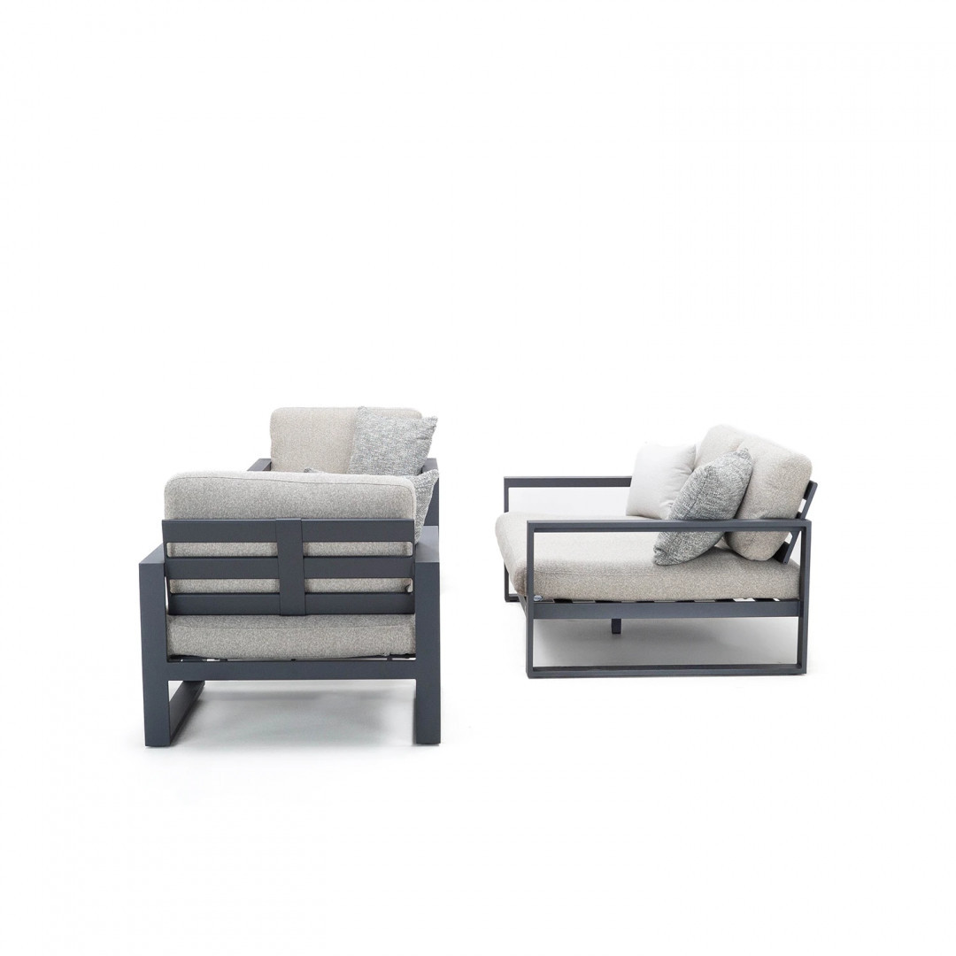 Алюминиевая конструкция с порошковым покрытием обеспечивает стабильность и устойчивость к воздействию внешних условий. Сиденья и спинки, обитые тканью Sunproof Jalousie и наполненные стандартным пенополиуретаном, отличаются долговечностью и сохраняют свою форму даже при регулярном использовании.