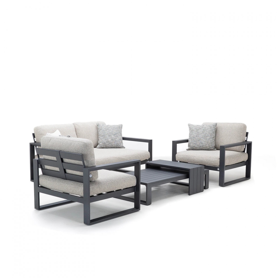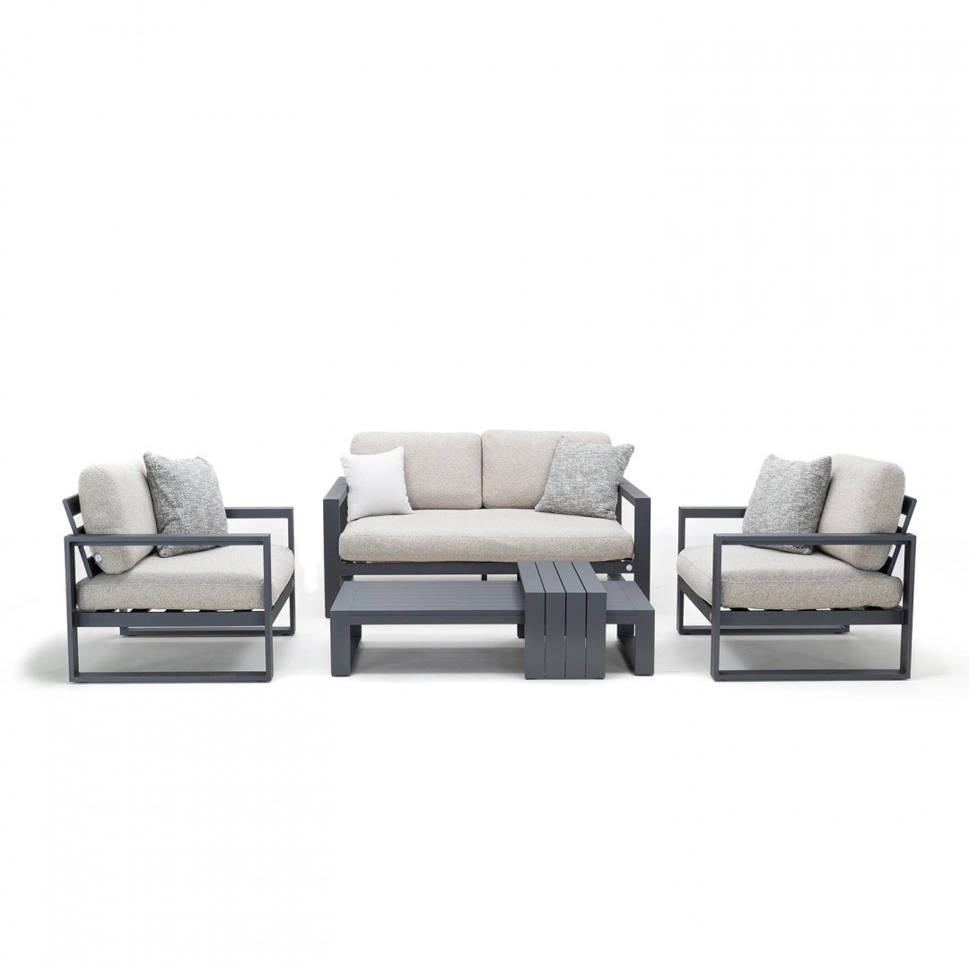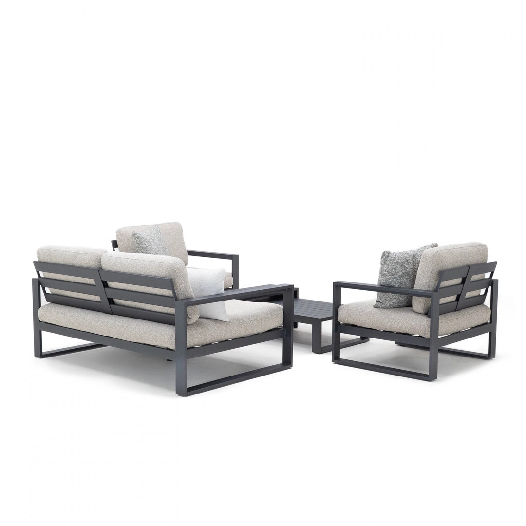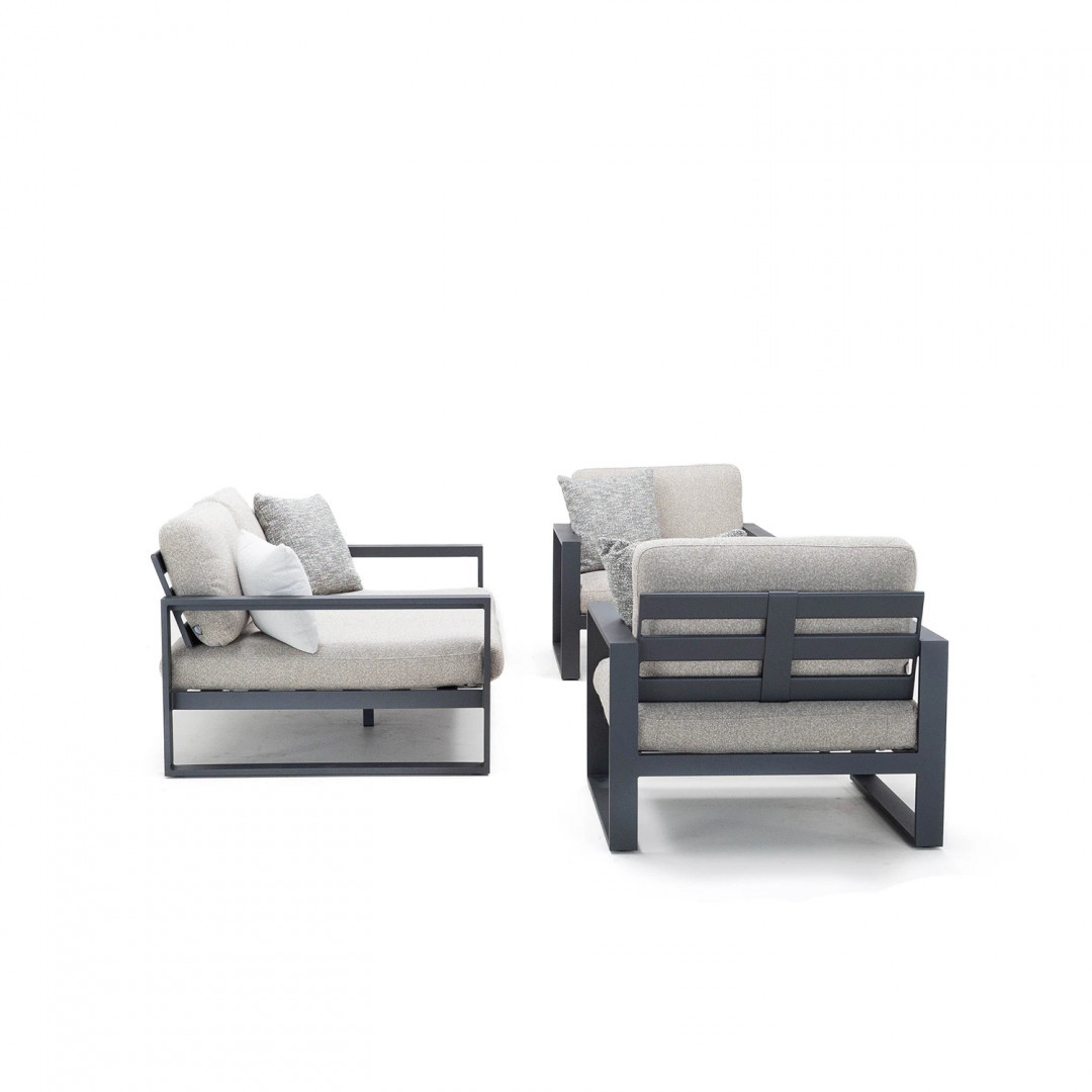 Алюминиевая конструкция с порошковым покрытием обеспечивает стабильность и устойчивость к воздействию внешних условий. Сиденья и спинки, обитые тканью Sunproof Jalousie и наполненные стандартным пенополиуретаном, отличаются долговечностью и сохраняют свою форму даже при регулярном использовании.