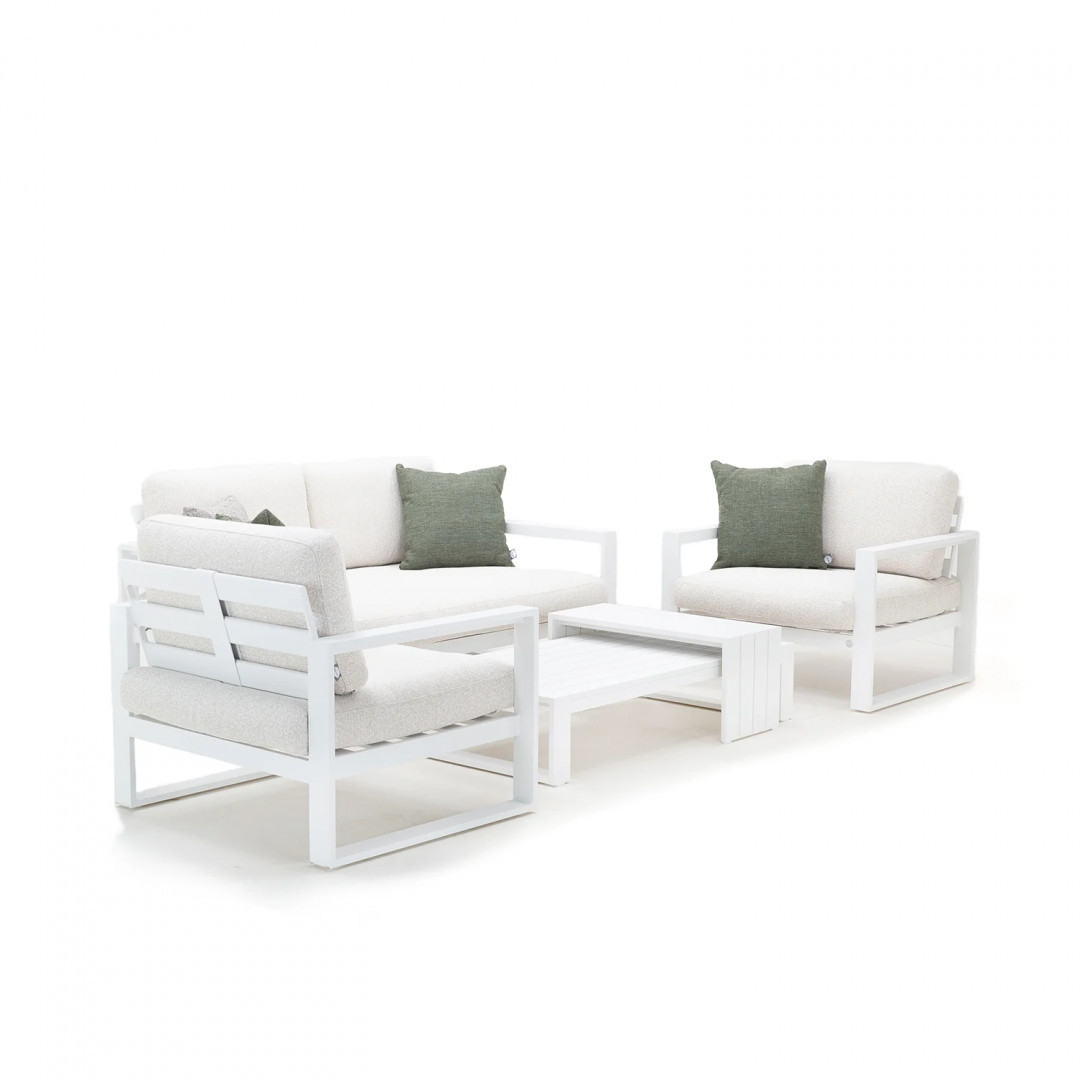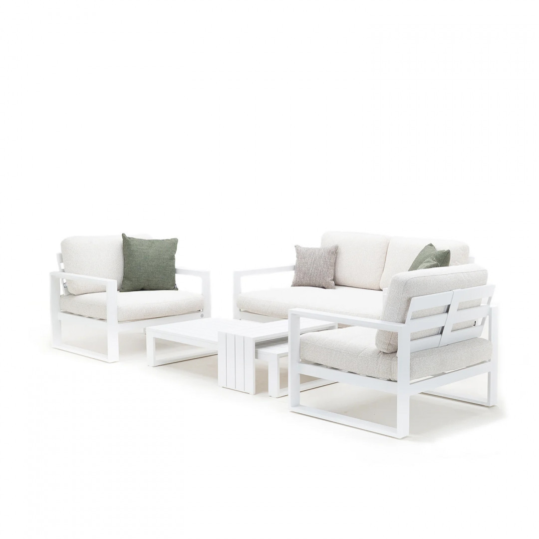 COSTA I – это комплект садовой мебели, предназначенный для создания комфортной зоны отдыха на террасе, патио или в саду. В комплект входят два кресла, двухместный диван с возможностью трансформации сидений и два журнальных столика разных размеров, что позволяет функционально использовать пространство.