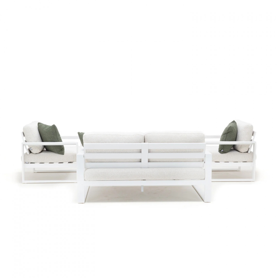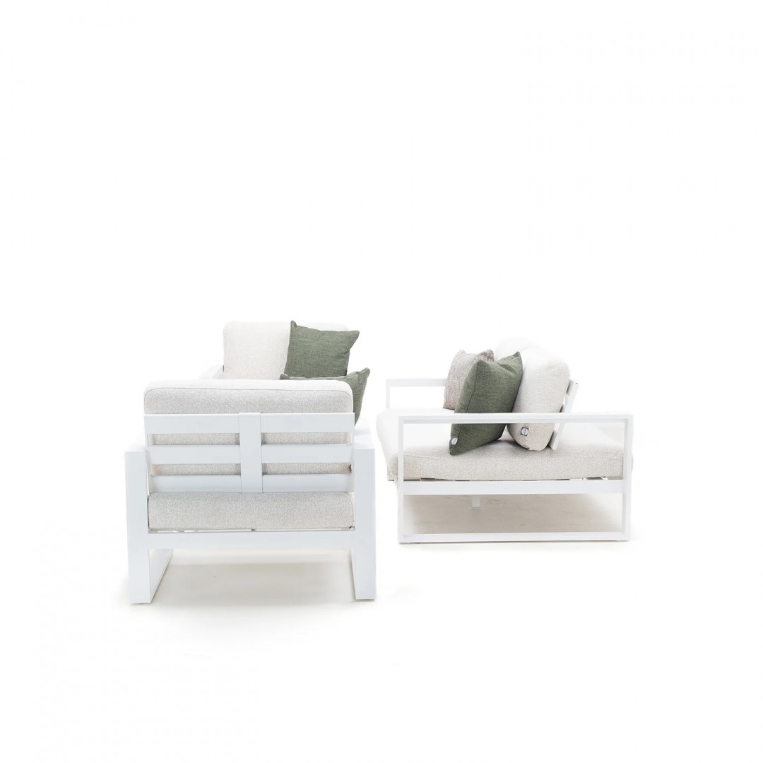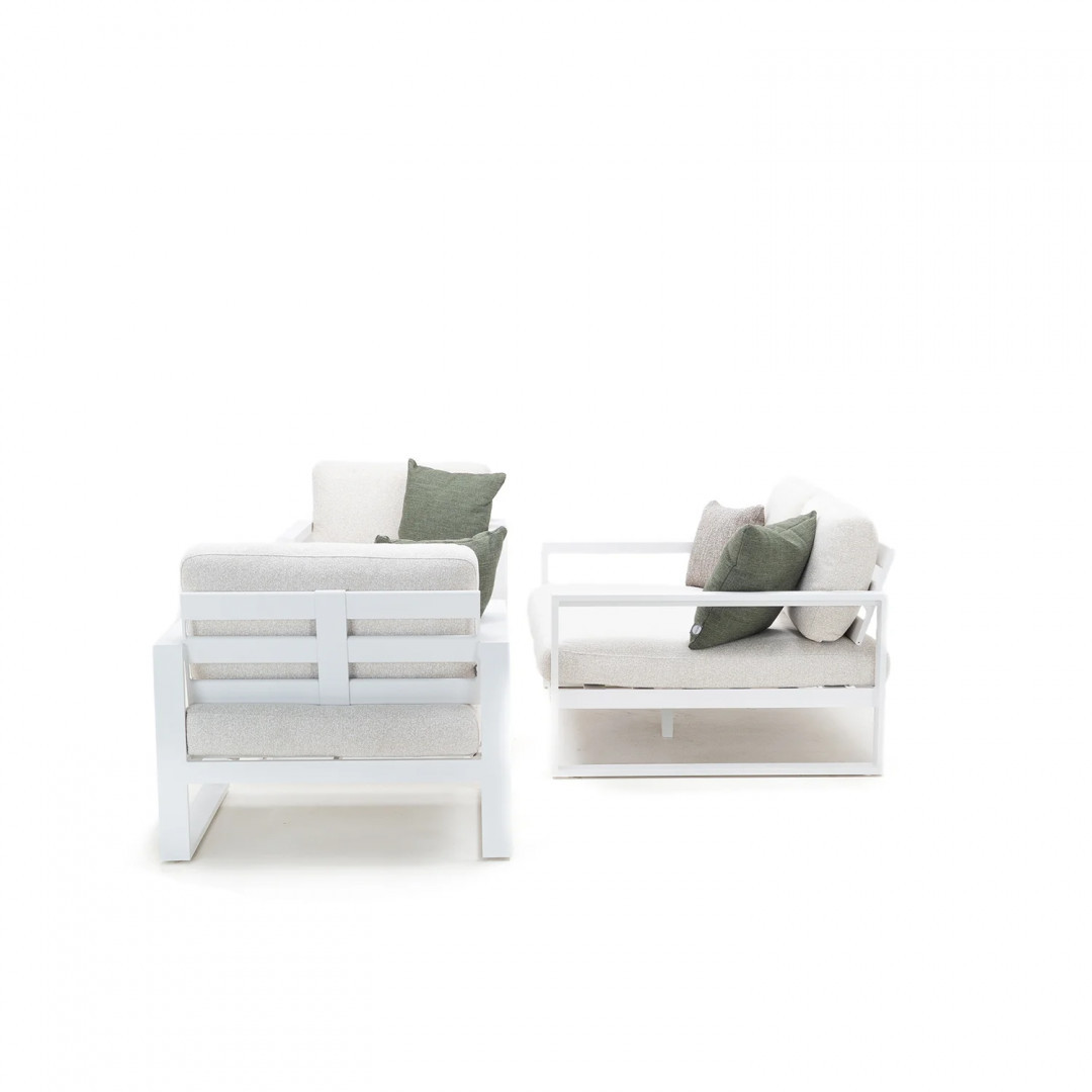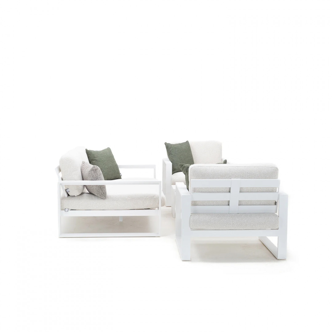 Алюминиевая конструкция с порошковым покрытием обеспечивает стабильность и устойчивость к воздействию внешних условий. Сиденья и спинки, обитые тканью Sunproof Jalousie и наполненные стандартным пенополиуретаном, отличаются долговечностью и сохраняют свою форму даже при регулярном использовании.