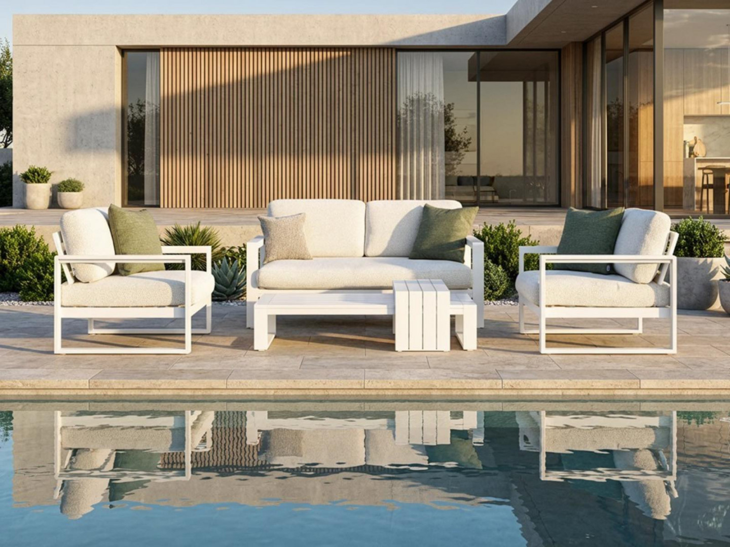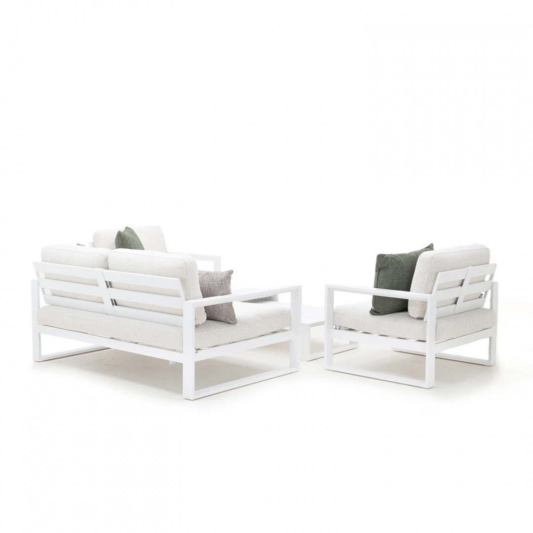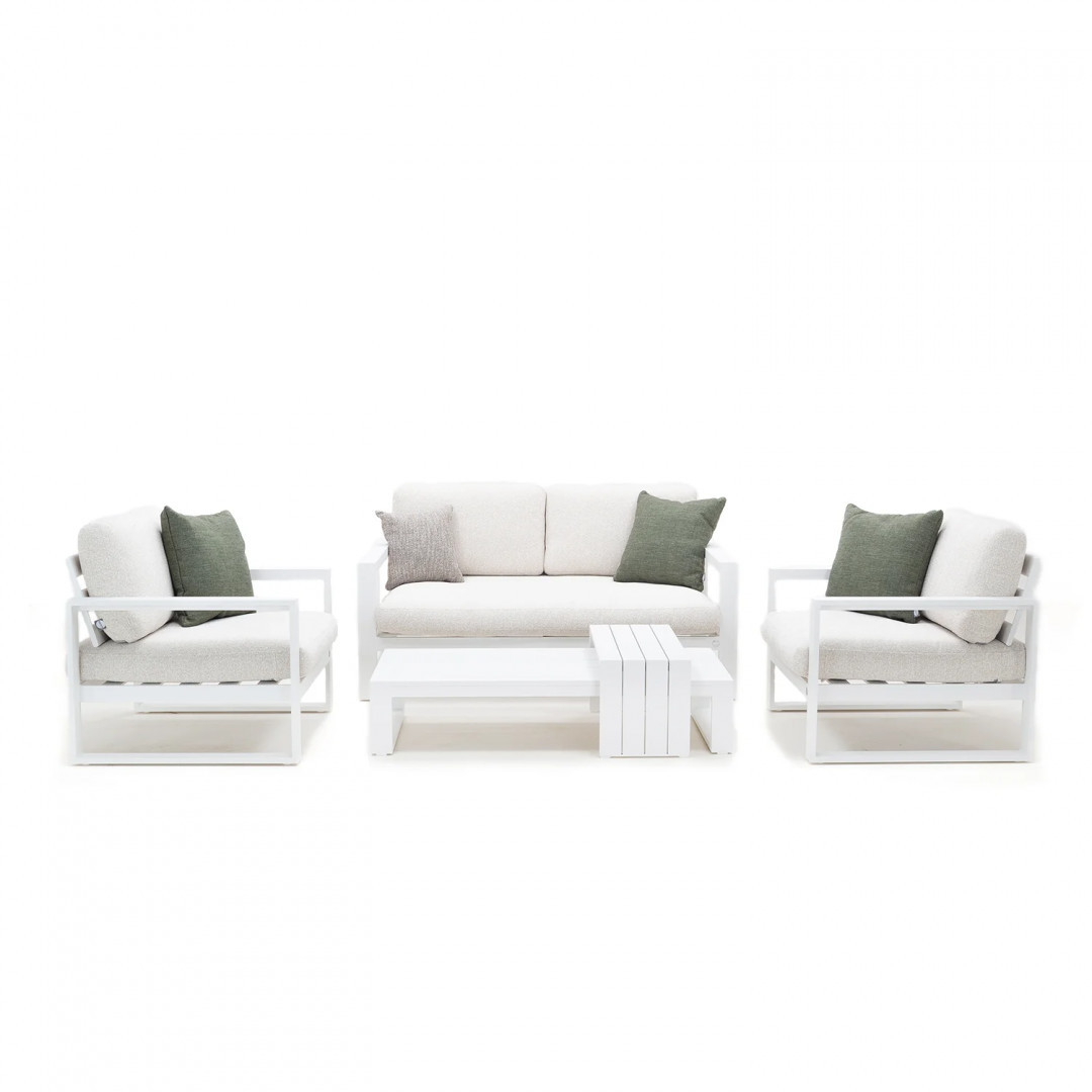 Алюминиевая конструкция с порошковым покрытием обеспечивает стабильность и устойчивость к воздействию внешних условий. Сиденья и спинки, обитые тканью Sunproof Jalousie и наполненные стандартным пенополиуретаном, отличаются долговечностью и сохраняют свою форму даже при регулярном использовании.