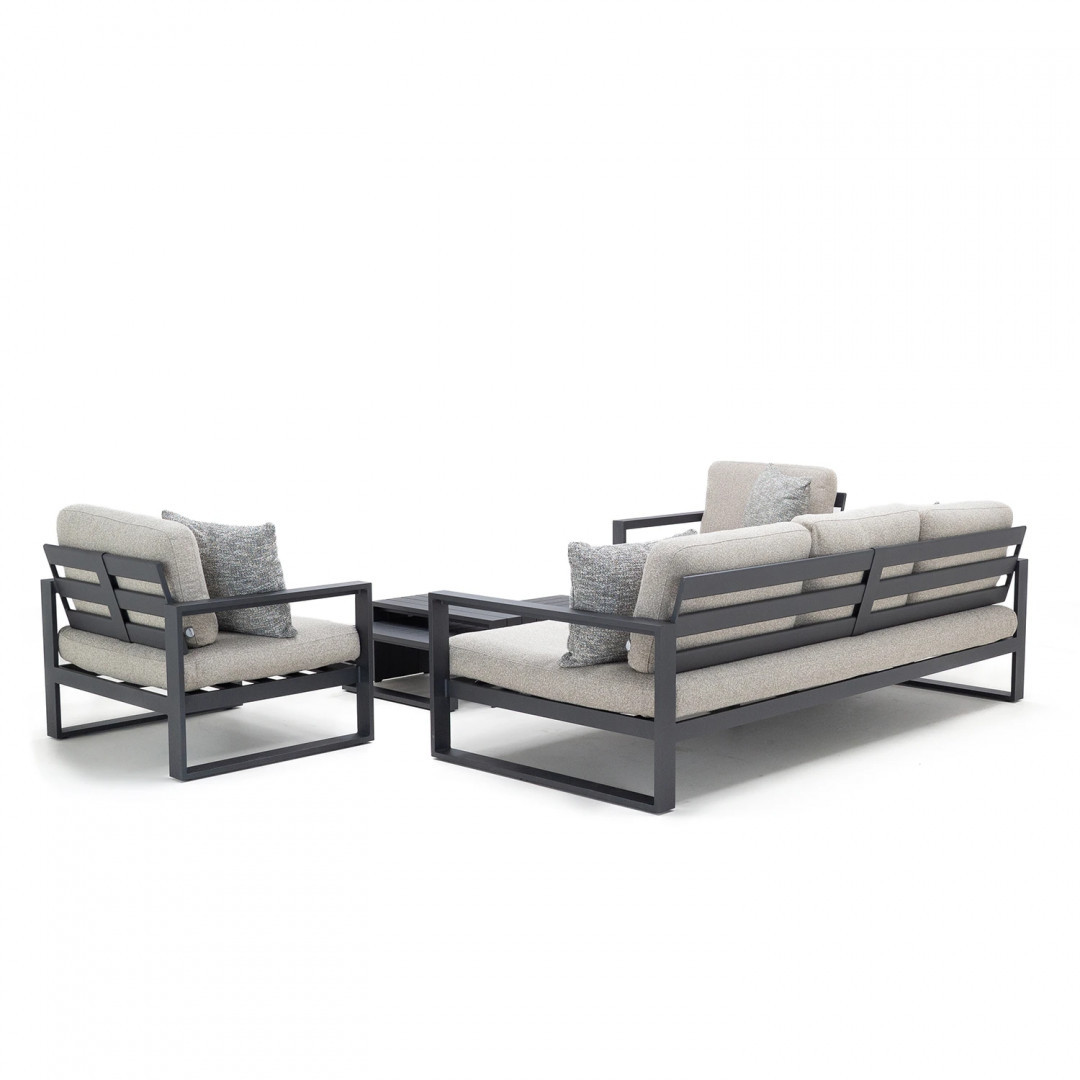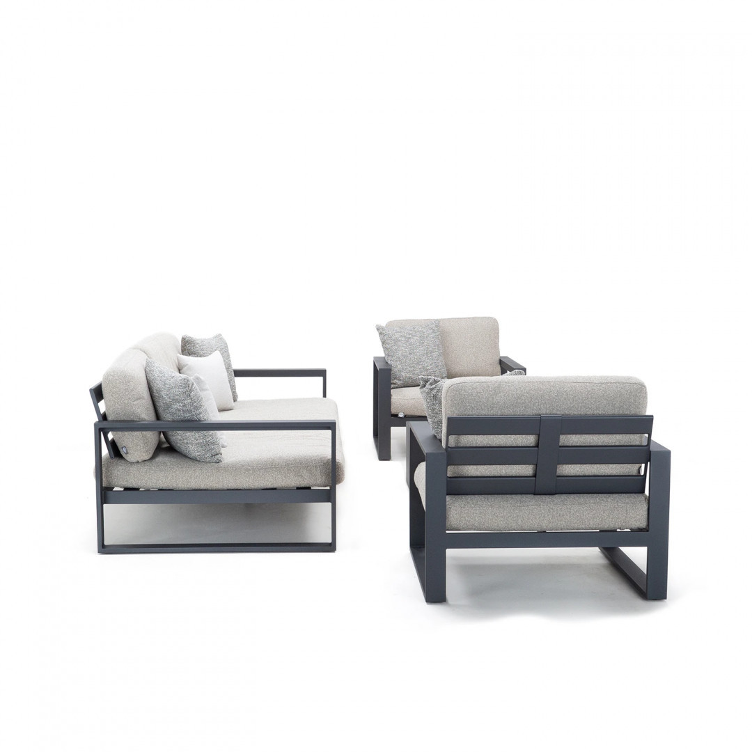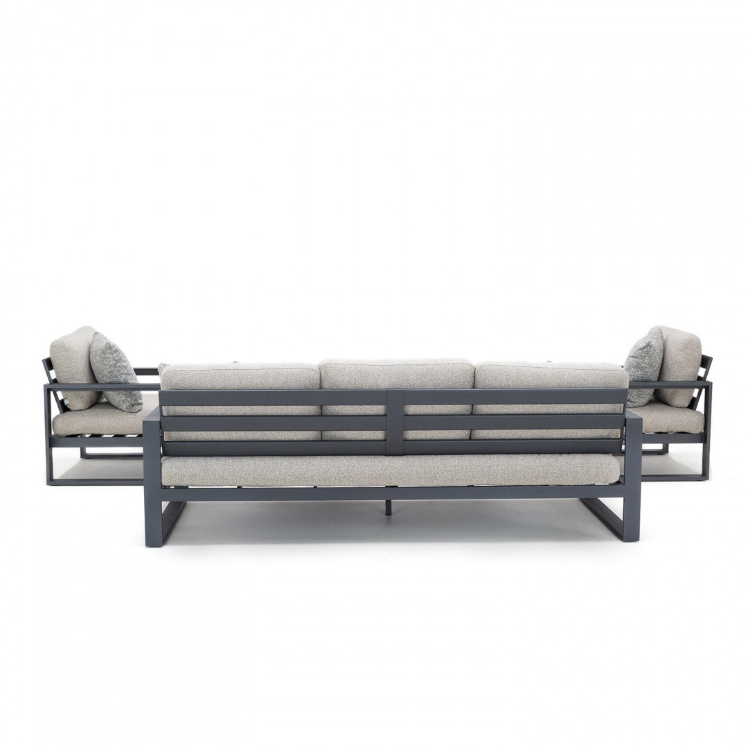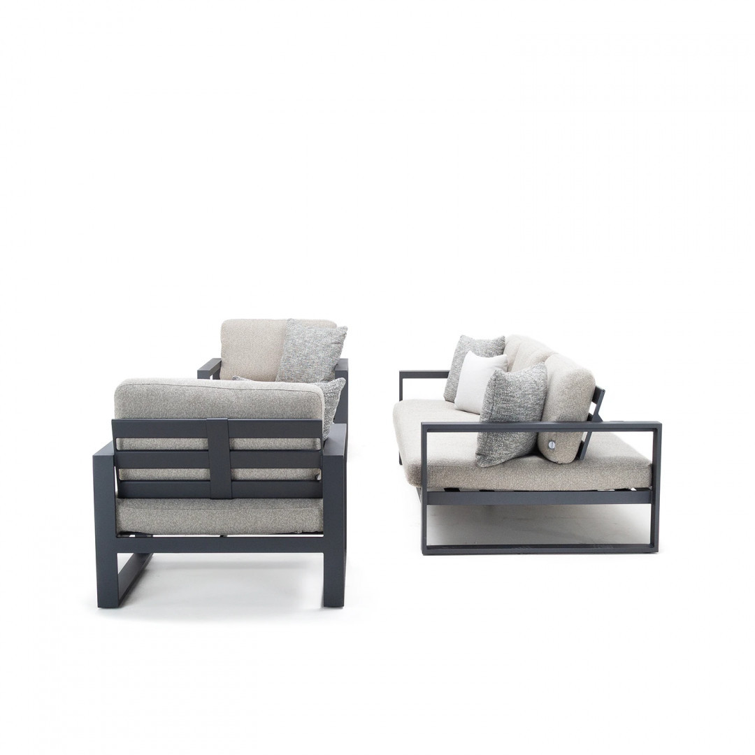 Алюминиевая конструкция с порошковым покрытием обеспечивает стабильность, долговечность и устойчивость к погодным условиям. Сиденья и спинки, обитые тканью Sunproof Jalousie 160 и наполненные стандартным пенополиуретаном, сохраняют свою форму и комфорт даже при интенсивном использовании. Дополнительные съемные подушки повышают комфорт и позволяют настроить комплект в соответствии с вашими индивидуальными предпочтениями.