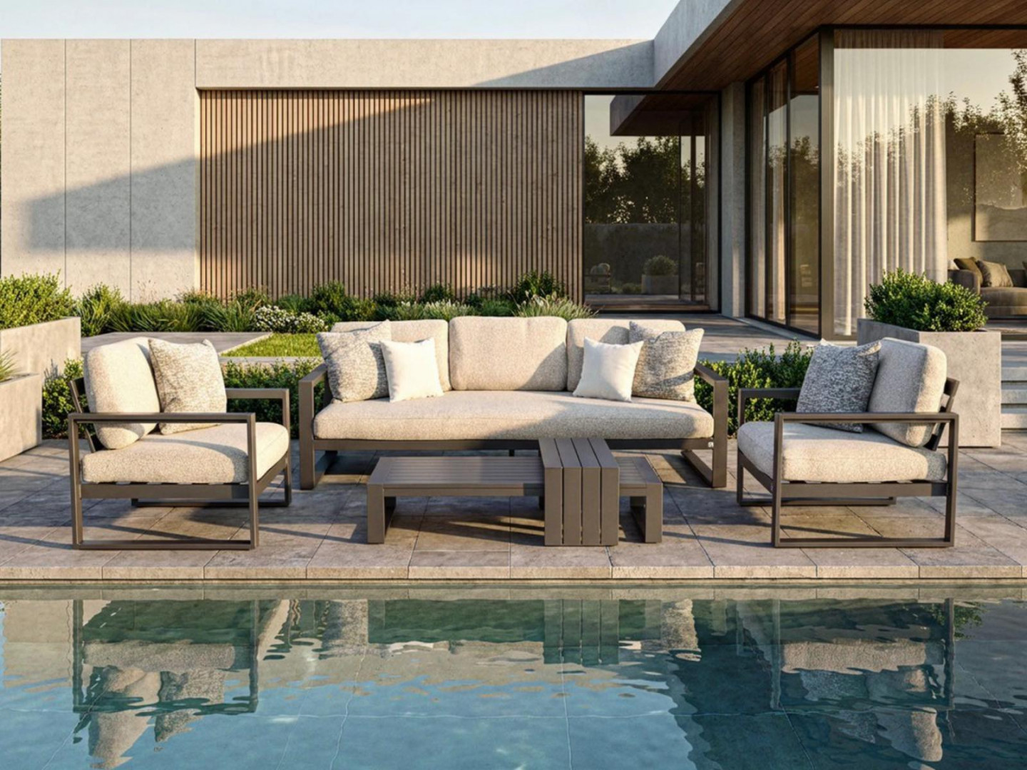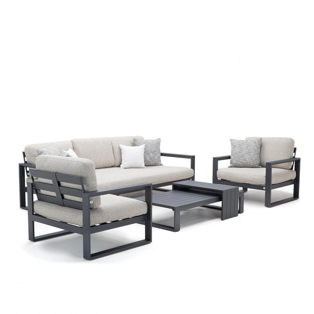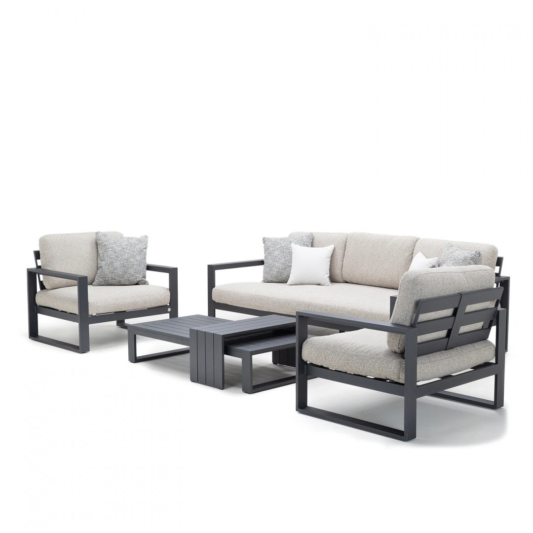 Алюминиевая конструкция с порошковым покрытием обеспечивает стабильность, долговечность и устойчивость к погодным условиям. Сиденья и спинки, обитые тканью Sunproof Jalousie 160 и наполненные стандартным пенополиуретаном, сохраняют свою форму и комфорт даже при интенсивном использовании. Дополнительные съемные подушки повышают комфорт и позволяют настроить комплект в соответствии с вашими индивидуальными предпочтениями.