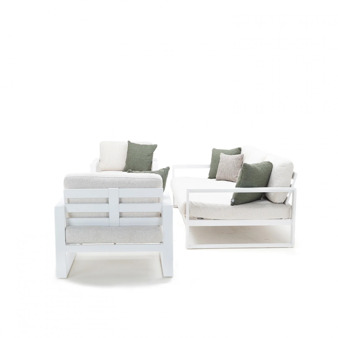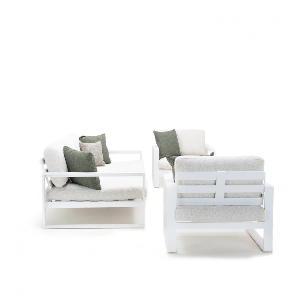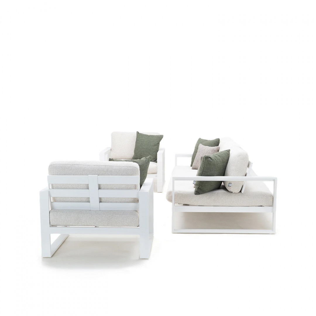 Алюминиевая конструкция с порошковым покрытием обеспечивает стабильность, долговечность и устойчивость к погодным условиям. Сиденья и спинки, обитые тканью Sunproof Jalousie 160 и наполненные стандартным пенополиуретаном, сохраняют свою форму и комфорт даже при интенсивном использовании. Дополнительные съемные подушки повышают комфорт и позволяют настроить комплект в соответствии с вашими индивидуальными предпочтениями.