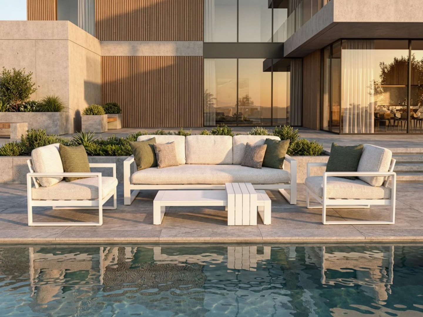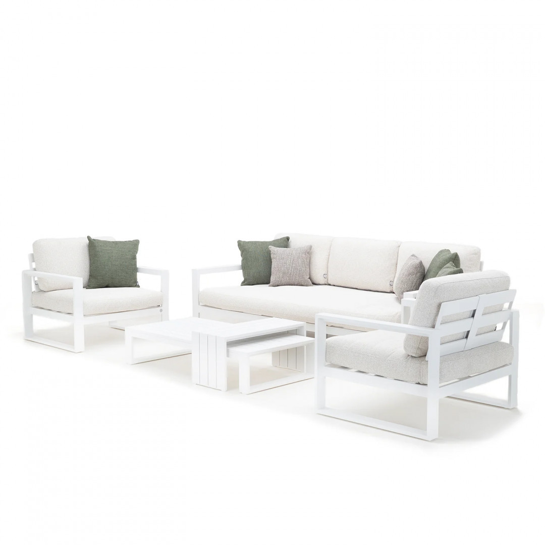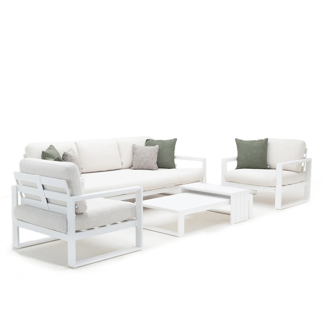 Алюминиевая конструкция с порошковым покрытием обеспечивает стабильность, долговечность и устойчивость к погодным условиям. Сиденья и спинки, обитые тканью Sunproof Jalousie 160 и наполненные стандартным пенополиуретаном, сохраняют свою форму и комфорт даже при интенсивном использовании. Дополнительные съемные подушки повышают комфорт и позволяют настроить комплект в соответствии с вашими индивидуальными предпочтениями.