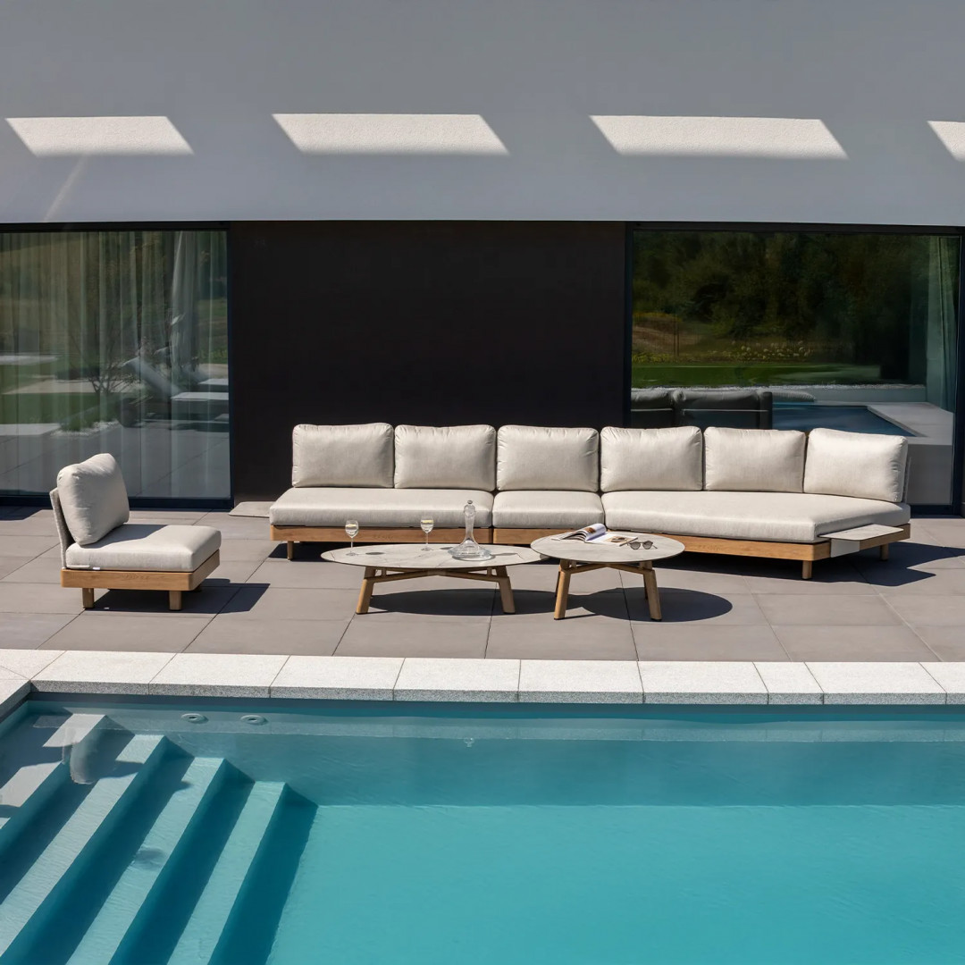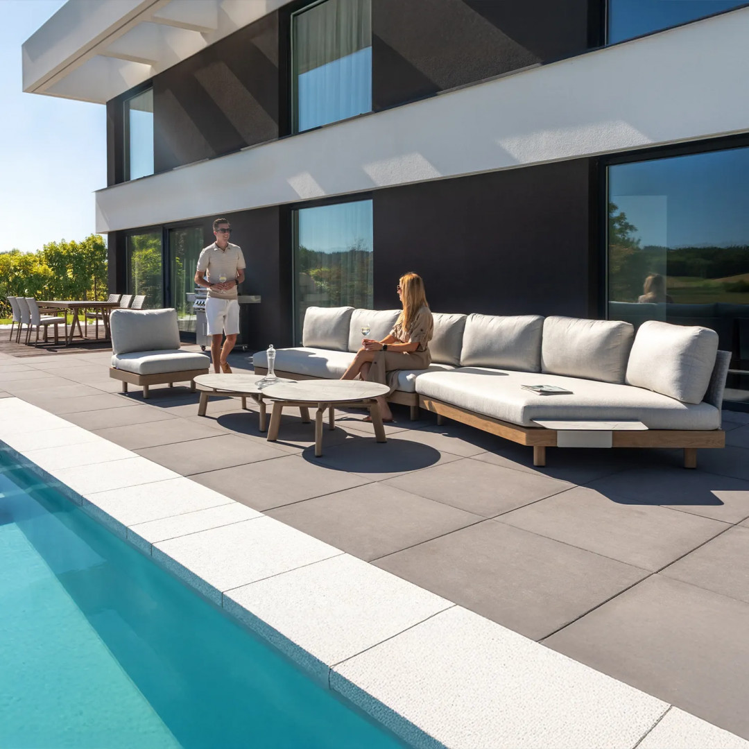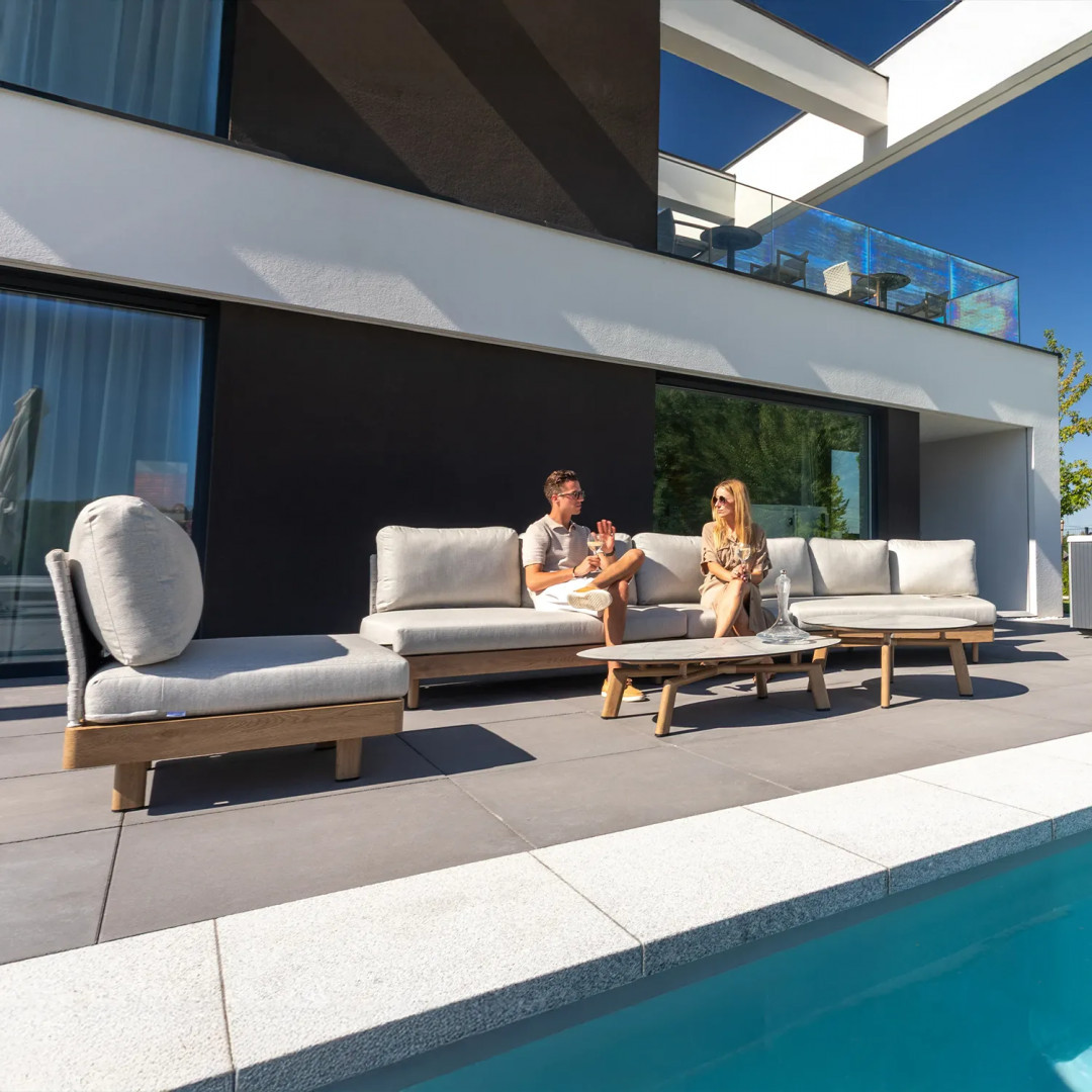 Откройте для себя новое измерение элегантности и комфорта с роскошным комплектом садовой мебели LOUNGE II от Couture Jardin – коллекцией, созданной с учетом самых взыскательных потребностей пользователей. Этот эксклюзивный комплект для отдыха, доступный в левостороннем и правостороннем вариантах, идеально дополнит просторные террасы, стильные сады и современные балконы. Каждый предмет впечатляет продуманным дизайном, модульной функциональностью и исключительным комфортом, создавая пространство, идеально подходящее для отдыха и встреч с близкими. Особого внимания заслуживает алюминиевый каркас с порошковым покрытием, отделанный текстурой, имитирующей натуральное дубовое дерево. Это уникальное решение сочетает в себе прочность и износостойкость металла с эстетикой и теплотой благородного дерева – без необходимости в уходе. Результат? Мебель, которая одновременно современна, изысканна и невероятно практична для использования на открытом воздухе.