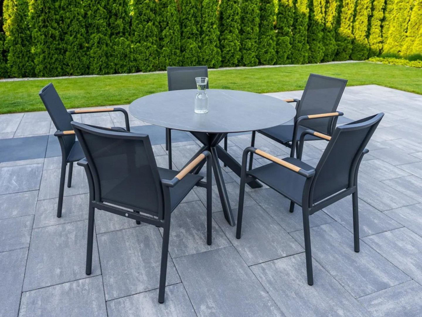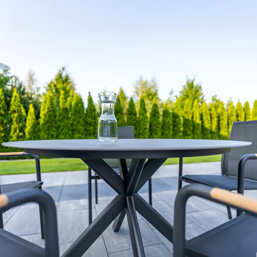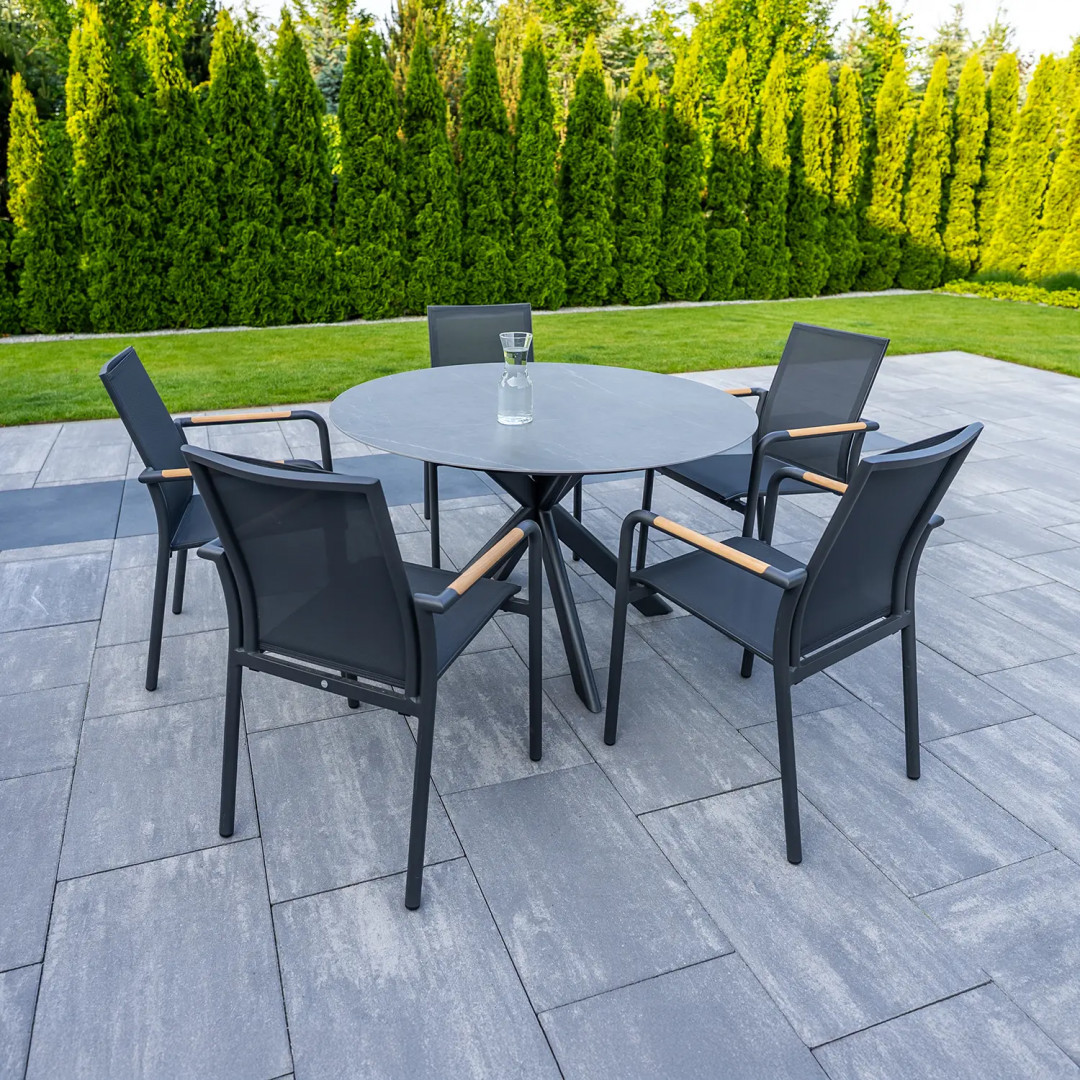 Ничто так не способствует расслаблению и совместному времяпрепровождению, как стильный и удобный садовый комплект. Комплект LUGO антрацит с пятью тиковыми стульями SOLLER – идеальное решение для тех, кто ищет сочетание современного дизайна, долговечности и исключительного комфорта. Тщательно подобранные материалы и сдержанная цветовая гамма гарантируют, что комплект гармонично впишется в любое открытое пространство – от минималистичных патио до уютных садов.