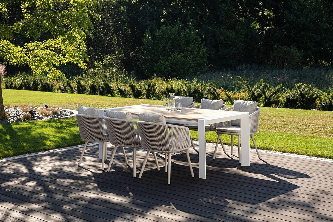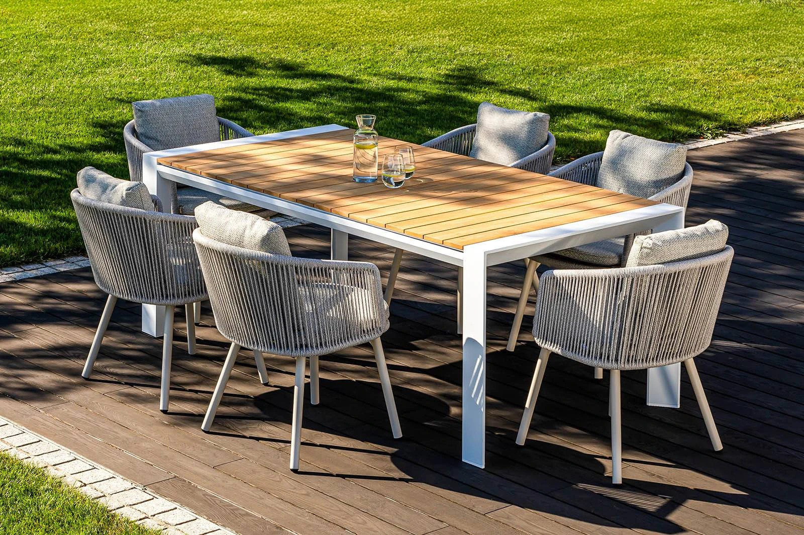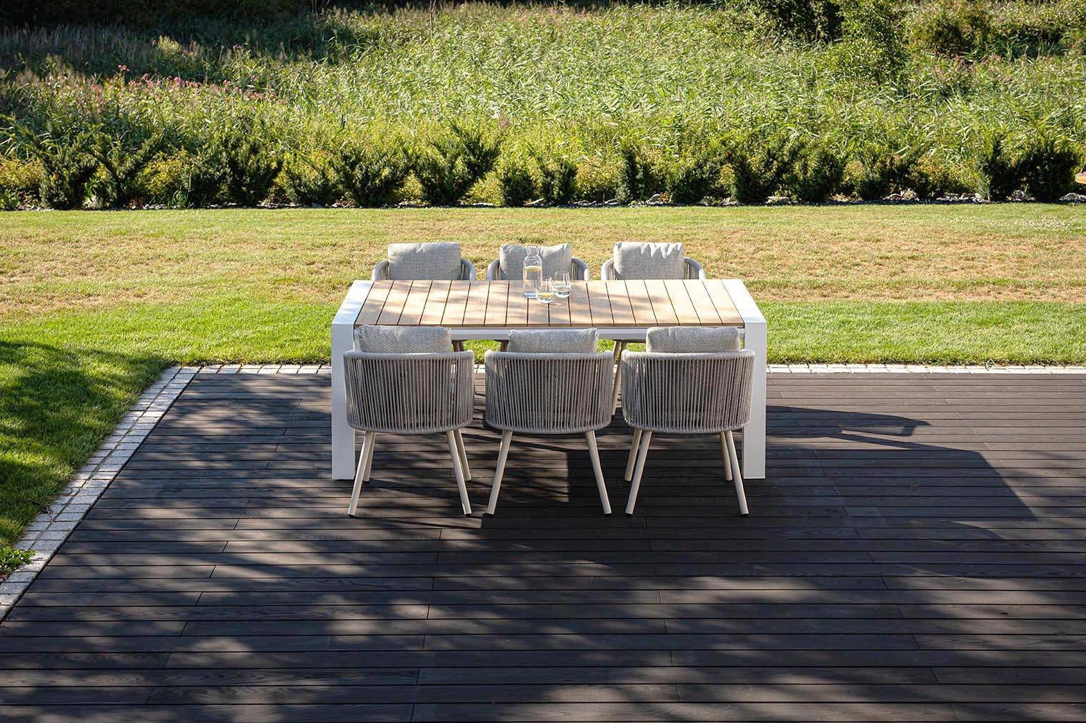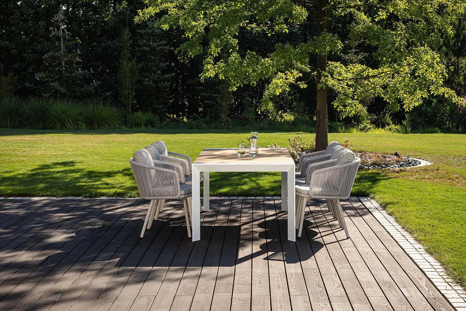 Представляем уникальный садовый комплект "MURO XIII", сочетающий в себе элегантность и современность, который украсит любое открытое пространство. Комплект "MURO XIII" – идеальный выбор для тех, кто ищет роскошь и комфорт на своей террасе или в саду. Сочетание элегантного стола MURO и шести удобных стульев Harbour цвета мокко создает неповторимую атмосферу, которая делает каждый момент на открытом воздухе незабываемым.