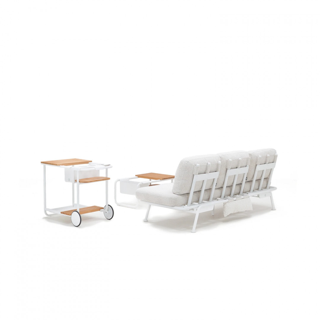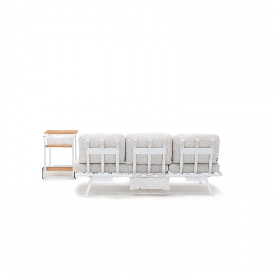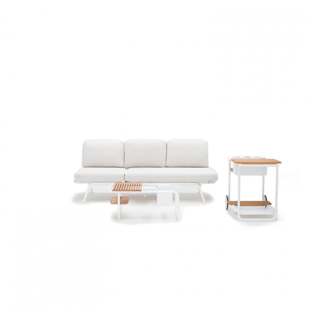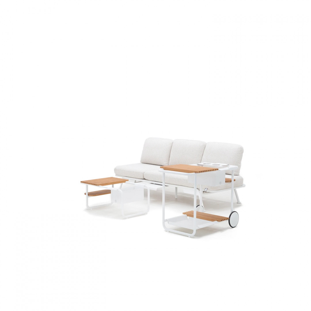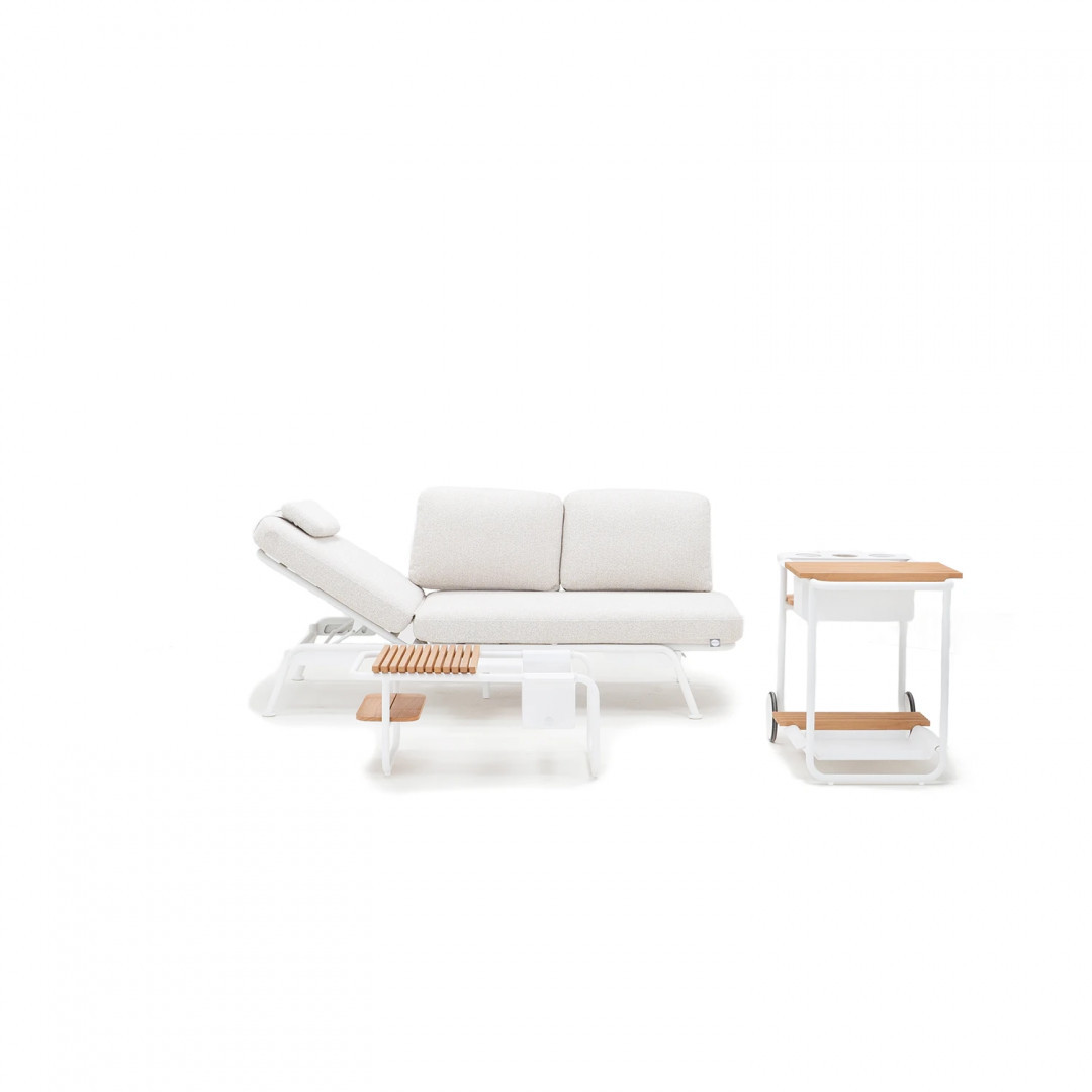 SUNSET – это комплект садовой мебели, разработанный для гибкого использования и повседневного комфорта на открытом воздухе. Центральным элементом комплекта является трехместный диван с регулируемыми спинками с обеих сторон, дополненный журнальным столиком и мобильной тележкой с подносами.