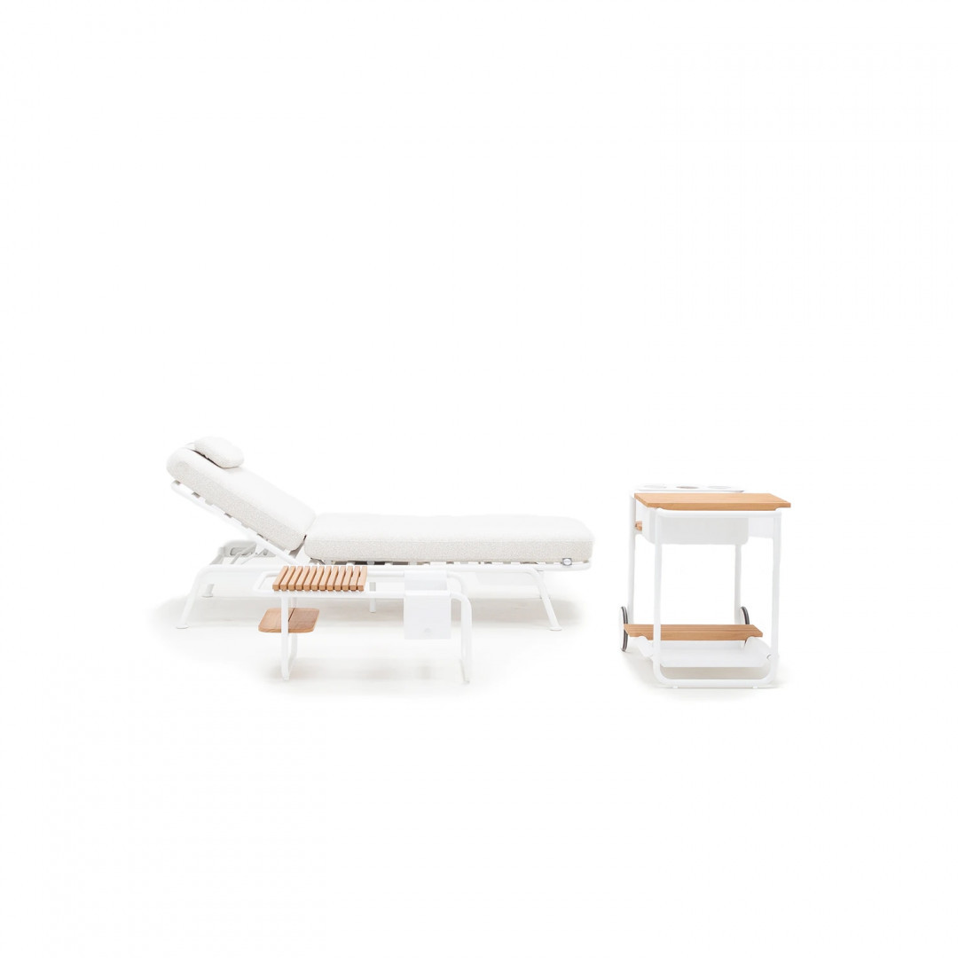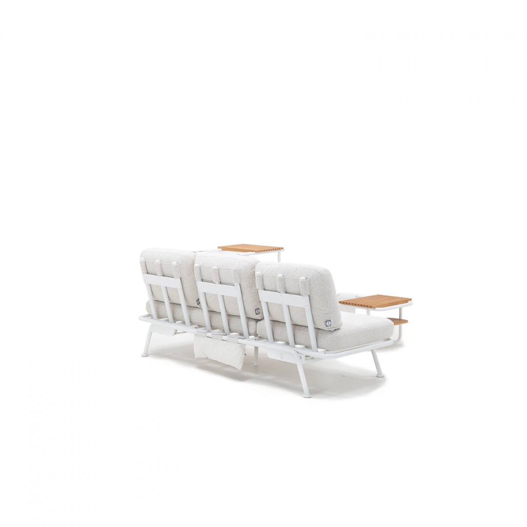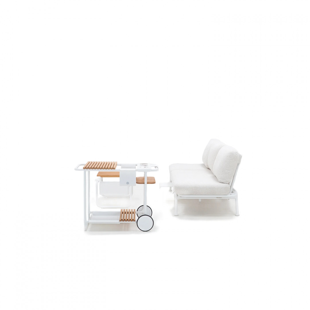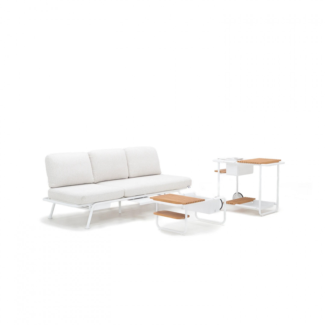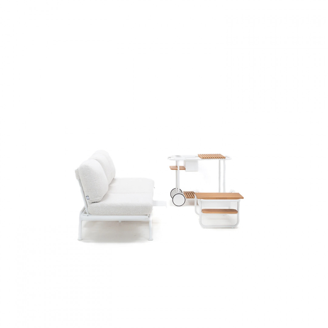 SUNSET – это комплект садовой мебели, разработанный для гибкого использования и повседневного комфорта на открытом воздухе. Центральным элементом комплекта является трехместный диван с регулируемыми спинками с обеих сторон, дополненный журнальным столиком и мобильной тележкой с подносами.