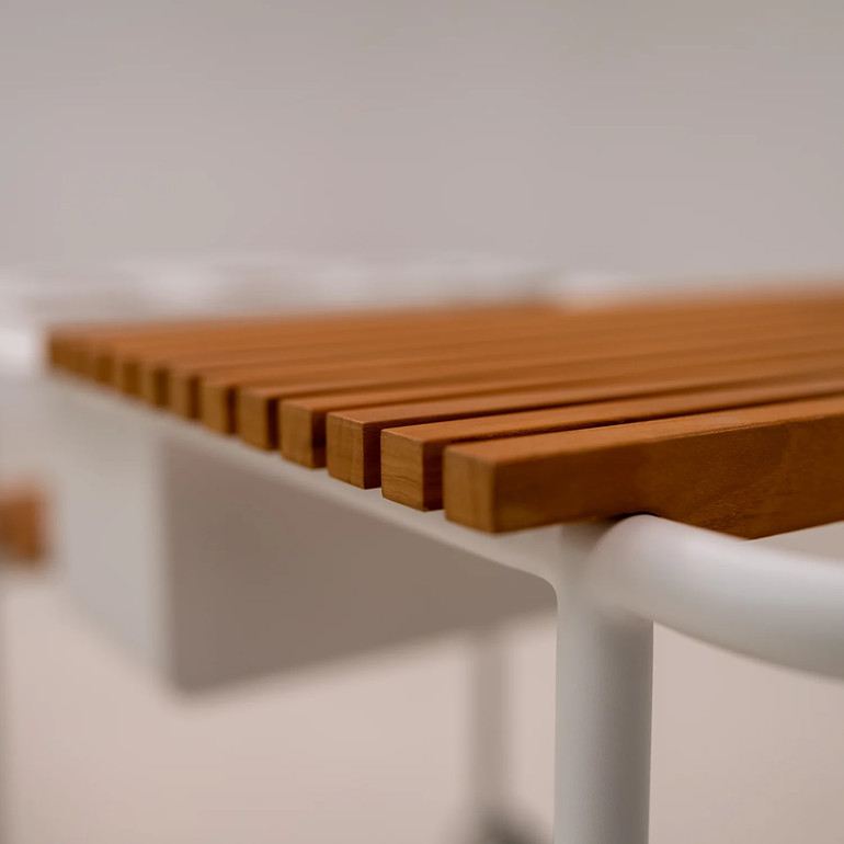 Алюминиевый каркас с порошковым покрытием обеспечивает стабильность и устойчивость к воздействию внешних условий. Сиденье и спинки, обитые тканью Sunproof Jalousie и наполненные стандартным пенополиуретаном, сохраняют свою форму при регулярном использовании. Элементы из тикового дерева, видимые на столе и тележке, добавляют комплекту натуральности и функциональности.