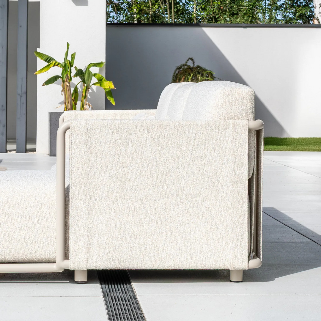 Алюминиевая конструкция с порошковым покрытием обеспечивает стабильность и устойчивость к воздействию внешних условий. Подушки сиденья и спинки, обитые тканью Sunproof, предназначены для использования на открытом воздухе, с акцентом на прочность материала и длительный комфорт.
