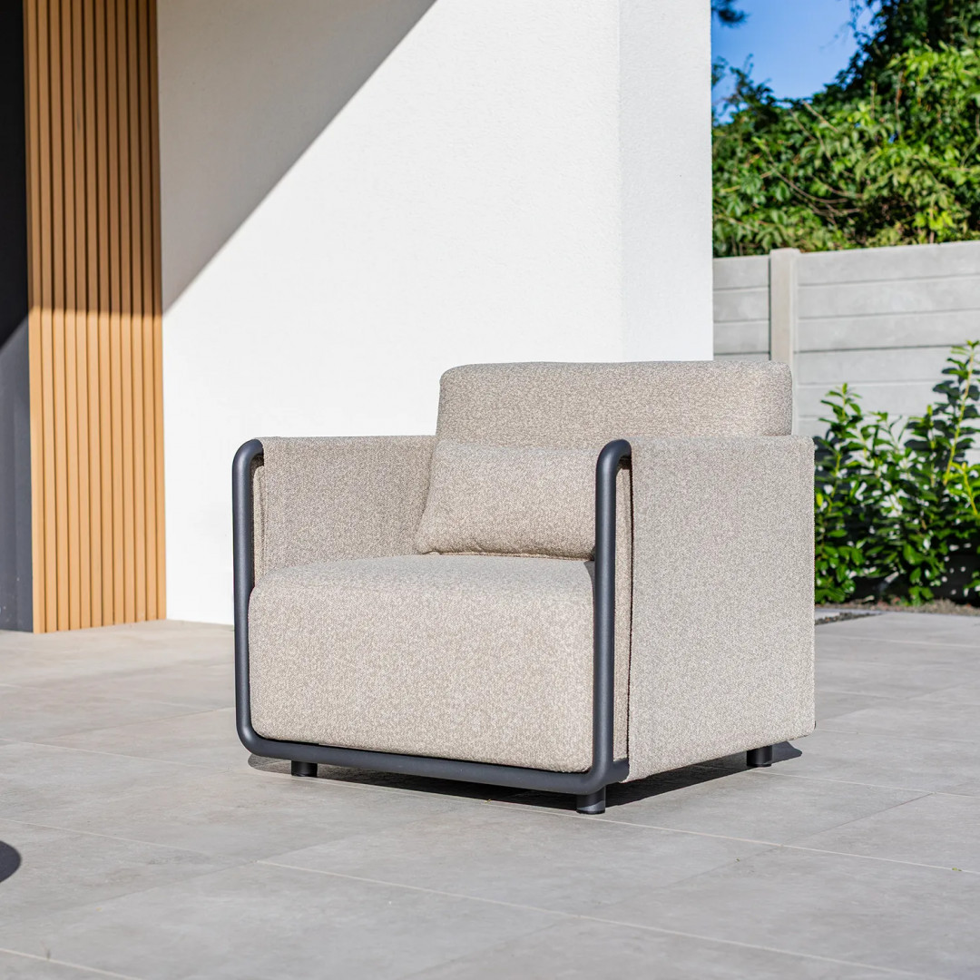 Алюминиевая конструкция с порошковым покрытием обеспечивает стабильность и устойчивость к воздействию внешних условий. Сиденье и спинка, обитые тканью Sunproof, предназначены для использования на открытом воздухе, обеспечивая долговечность и комфорт для повседневного отдыха.