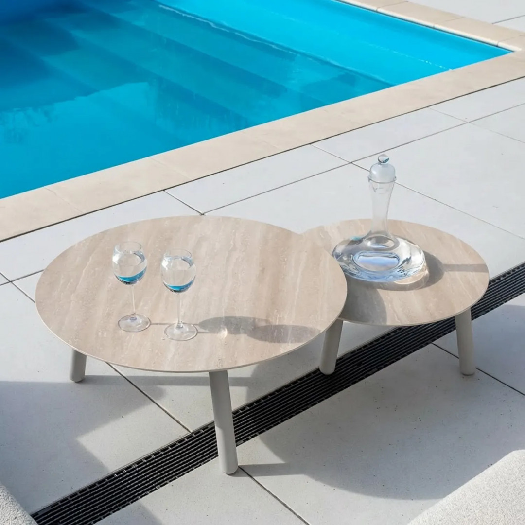 ZEN IV отличается упрощенным дизайном, ориентированным на расслабление без необходимости в дополнительных боковых блоках. Это делает комплект хорошо подходящим для мест, где важен баланс между комфортом и пространством. Два журнальных столика разного диаметра дополняют комплект, предлагая практичное полезное пространство, не нарушая при этом легкость композиции.