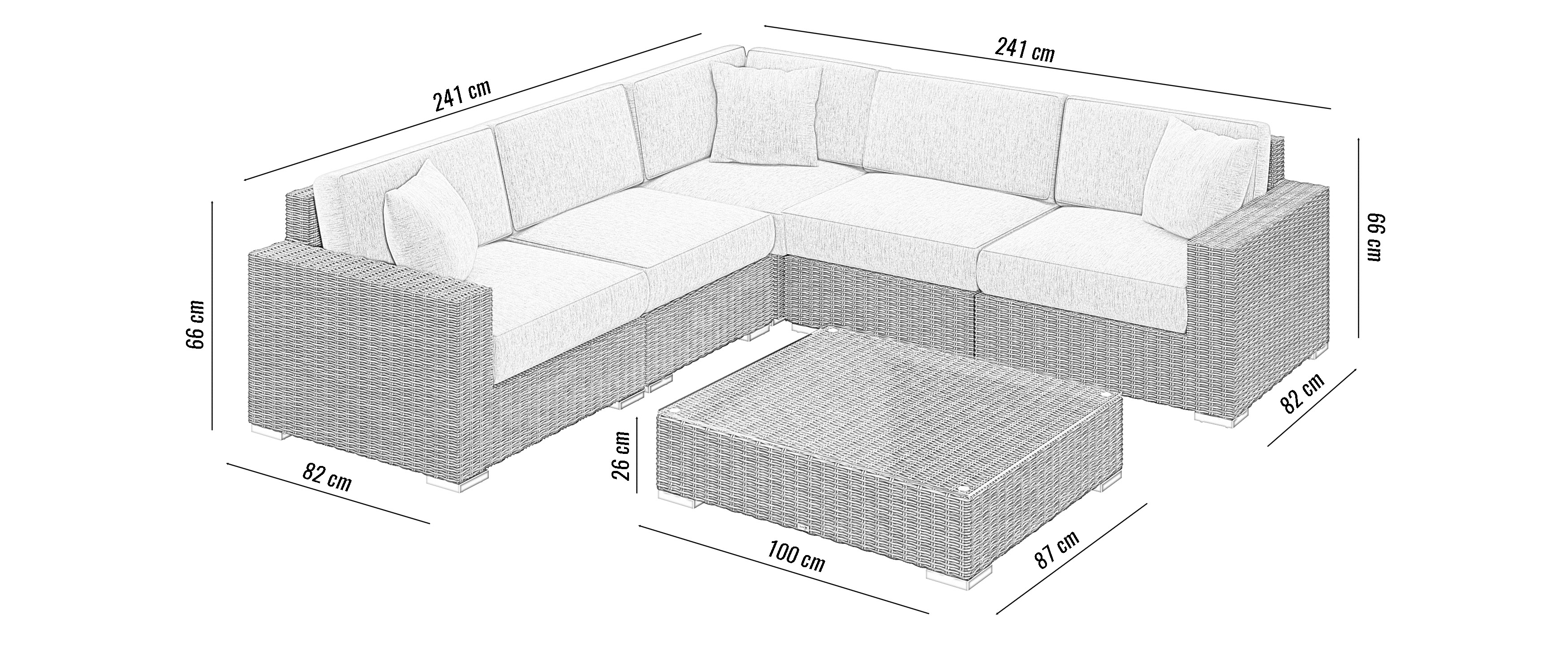 Комплект садовой мебели из техноротанга МИЛАНО II (MILANO II) песок - это предложение, посвященное людям, желающим со вкусом обустроить большие пространства. Благодаря изобилию компонентов, соединяющихся между собой модульно, Вы можете творчески формировать свое окружение. Комплект состоит из двух центральных и трех угловых элементов, из которых Вы можете создать удобный угловой дизайн и которые поместят всех Ваших друзей и семью во время праздничной вечеринки в саду. У Вас появится дополнительное место для сидения, когда одним движением Вы превратите техноротанговый стол в удобный пуф.